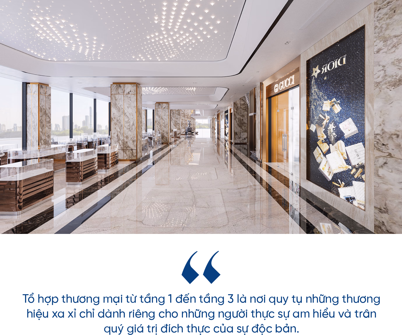 Với những tín đồ mua sắm, đại tổ hợp thương mại, mua sắm, giải trí và ẩm thực đẳng cấp từ tầng 1 đến tầng 3 sẽ là điểm đến "must try". Quy tụ thế giới riêng tư của các món hàng hiệu độc bản, nơi đây sẽ trở thành một trong những tâm điểm mua sắm quy mô bậc nhất khu Đông Hà Nội, với bộ sưu tập những thương hiệu tên tuổi hàng đầu thế giới. Cộng hưởng cùng tổ hợp dịch vụ thư giãn & chăm sóc sức khoẻ toàn diện, với từng liệu pháp được cá nhân hóa theo nhu cầu riêng của khách hàng, đây cũng là nơi mang đến trải nghiệm phục hồi và tái tạo cơ thể, giúp cân bằng thân - tâm - trí cho mọi cư dân tinh hoa.