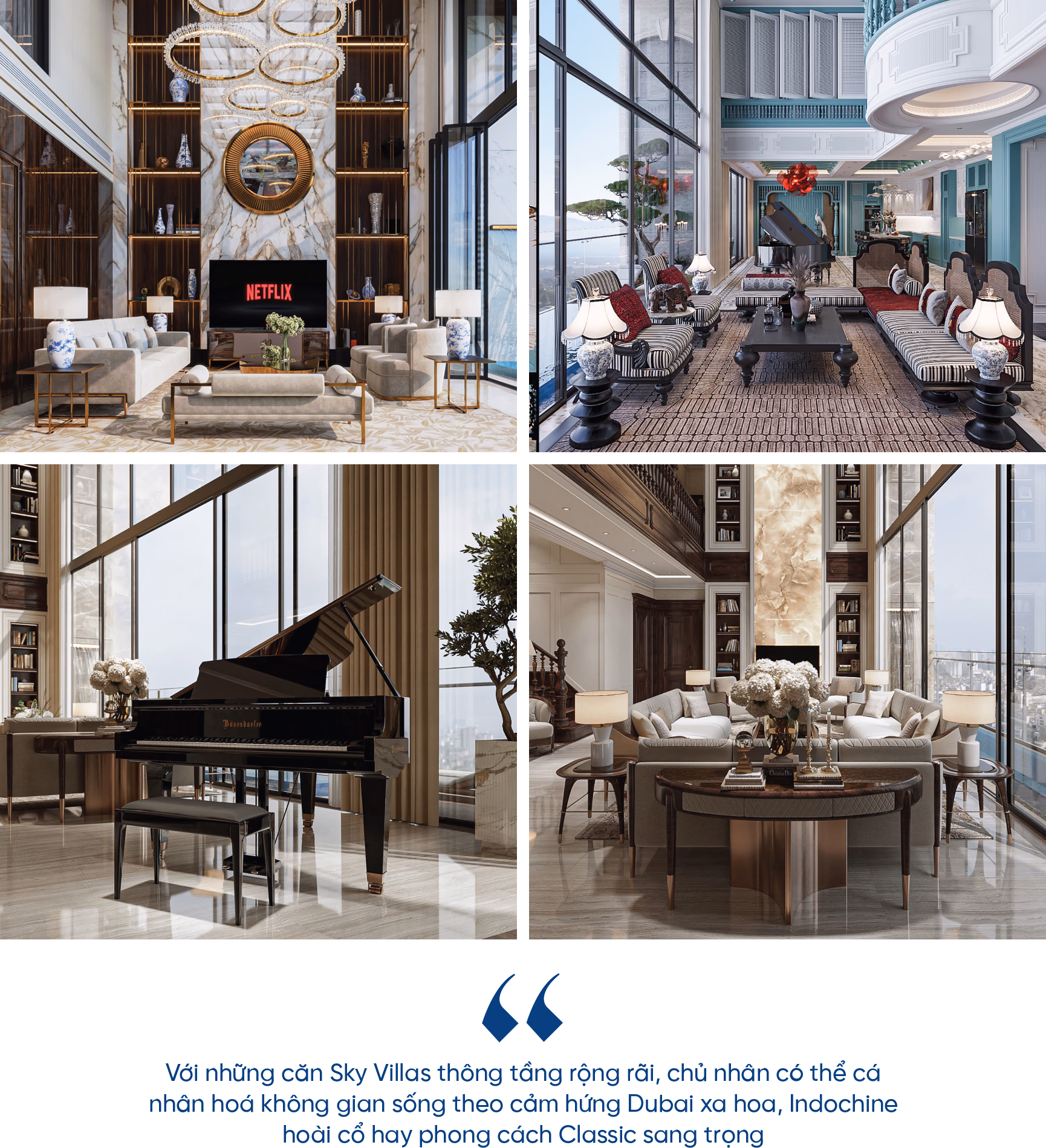 Kết hợp với nguyên vật liệu hoàn thiện được chế tác tinh xảo từ đá và gỗ tự nhiên, cùng trang thiết bị bàn giao cơ bản đến từ các thương hiệu danh tiếng hàng đầu thế giới, mỗi căn hộ Sky Villas sẽ là một tác phẩm nghệ thuật đích thực - nơi không gian sống không chỉ là sự giao thoa của tiện nghi và vẻ đẹp, mà còn là biểu tượng của sự đẳng cấp và tinh tế.