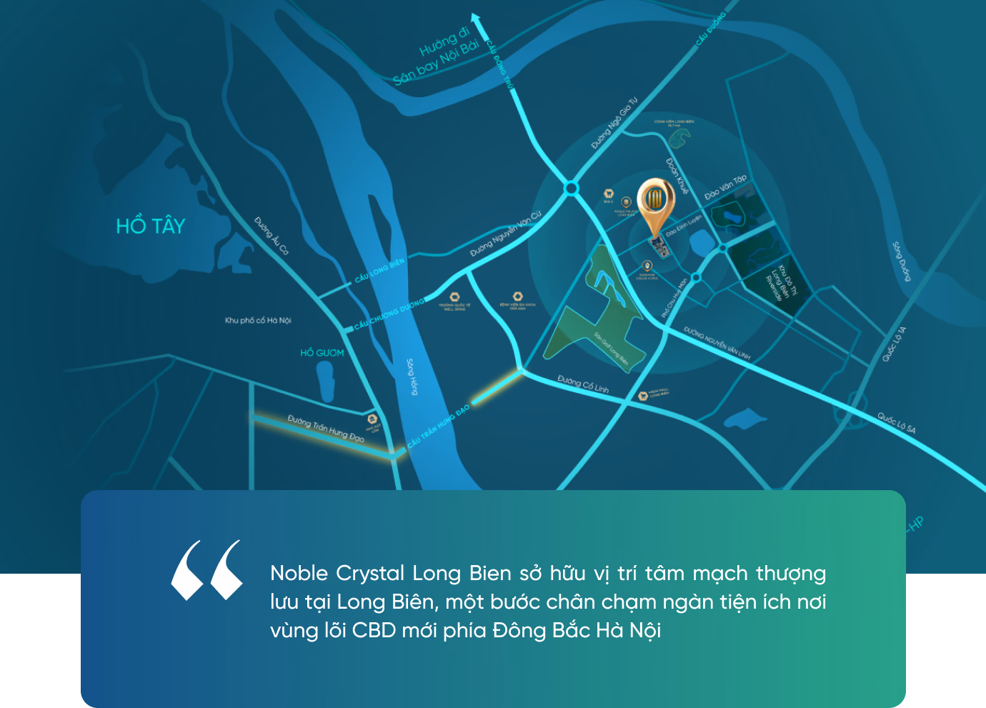 Nhờ hạ tầng siêu kết nối của khu vực phía Đông Hà Nội, Long Biên đang dần trở thành "tọa độ" thịnh vượng mới cho tầng lớp tinh hoa khi khu vực này đang phát triển trở thành trung tâm kinh tế (CBD) mới của Hà Nội. Với vị trí tâm mạch thượng lưu nằm ngay tại lõi CBD này, từ Noble Crystal Long Bien, cư dân chỉ mất chưa đến 20 phút để tới sân bay Nội Bài, chưa đến 10 phút để di chuyển tới trung tâm phố cổ và Hồ Gươm sau khi siêu cầu Trần Hưng Đạo khánh thành và đi vào hoạt động.