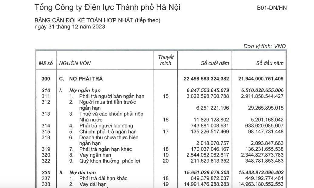 Tính đến ngày 31/12/2023, EVN Hà Nội có khoản nợ vay hơn 17.535 tỷ đồng, chiếm gần 78% nợ phải trả. Trong đó, phần lớn là ở vay dài hạn với hơn 14.991 tỷ đồng.