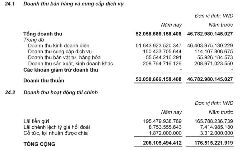 Trong đó, doanh thu kinh doanh điện là 51.644 tỷ đồng, tăng 11,3%; doanh thu cung cấp dịch vụ là 150,4 tỷ đồng, tăng 32%. Trong khi đó, doanh thu sản xuất, kinh doanh khác 208,7 tỷ đồng, không biến động so với năm trước.