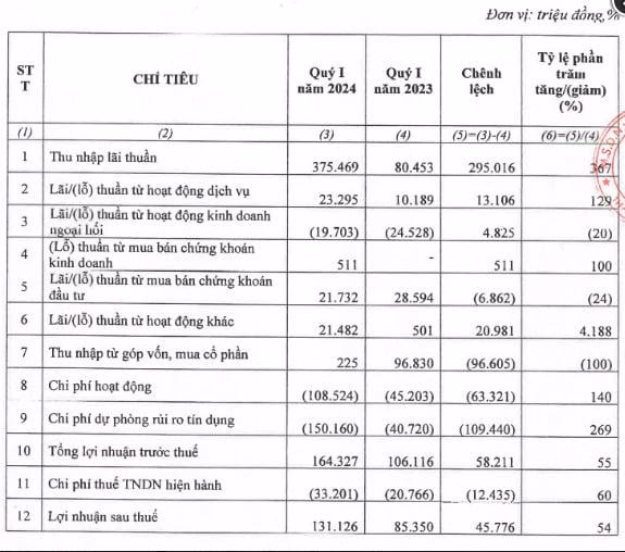 Về kết quả kinh doanh quý 1/2024, EVNFinance ghi nhận lợi nhuận trước thuế của công ty tăng gần 55% so với cùng kỳ. Thu nhập lãi thuần đạt kết quả ấn tượng ở mức 375,4 tỷ đồng, tăng gần gấp 5 lần so với cùng kỳ. Lãi thuần từ hoạt động dịch vụ tăng gần 30%, đạt mức 23,2 tỷ đồng.
