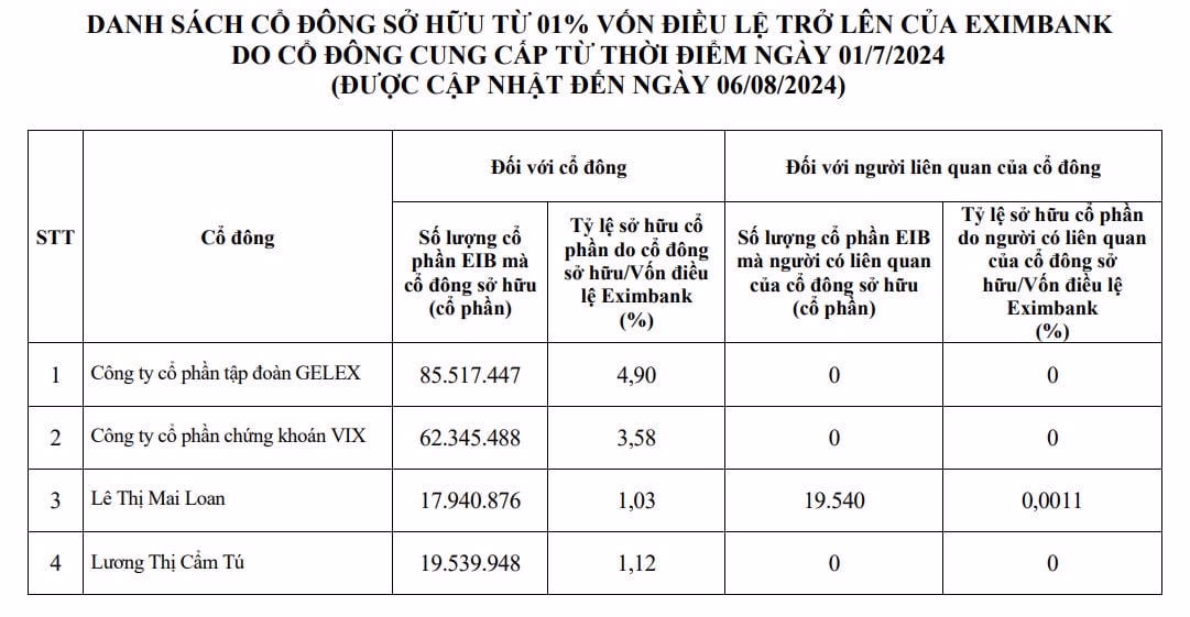 Ngân hàng TMCP Xuất Nhập Khẩu Việt Nam (Eximbank, mã chứng khoán EIB) vừa cập nhật danh sách cổ đông sở hữu từ 1% vốn điều lệ của ngân hàng đến ngày 6/8/2024.