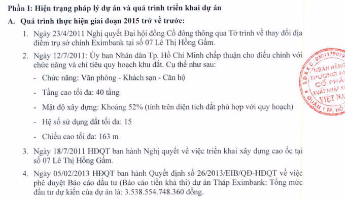Được biết, lô đất số 7 tại đường Lê Thị Hồng Gấm được Eximbank mua lại từ năm 2009 và sử dụng làm trụ sở đến năm 2011. Từ tháng 4/2011, HĐQT thông qua thay đổi địa điểm trụ sở chính. Tháng 7/2011, Eximbank được UBND TP HCM chấp thuận cho điều chỉnh chức năng và chỉ tiêu quy hoạch khu đất. Trong đó, lô đất có diện tích khoảng hơn 3.500 m2 có chức năng văn phòng - căn hộ - khách sạn, cao 40 tầng, mật độ xây dựng khoảng 52%, chiều cao tối đa 163 m. Theo báo cáo đầu tư HĐQT phê duyệt năm 2013, tổng mức đầu tư dự kiến khoảng hơn 3.538 tỷ đồng.