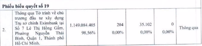 Theo nội dung tại tờ trình, ngân hàng này sẽ đầu tư xây dựng Tháp Eximbank bằng 100% nguồn vốn tự có, HĐQT nhiệm kỳ VII (2020-2025) có nhiệm vụ triển khai công tác lập và trình phê duyệt quy hoạch, lập và trình phương án kiến trúc, lập báo cáo đầu tư xây dựng tòa nhà Eximbank phù hợp với chủ trương đầu tư của ngân hàng và quy hoạch của TP HCM để trình ĐHCĐ trong những kỳ đại hội tiếp theo để phê duyệt trước khi thực hiện.