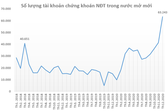 Chuỗi ngày tăng điểm ấn tượng của thị trường chứng khoán đã kéo theo hàng loạt nhà đầu tư mở mới tài khoản chứng khoán. Số liệu từ Trung tâm lưu ký Chứng khoán Việt Nam (VSD) cho biết trong tháng 12, nhà đầu tư trong nước đã mở mới 63.243 tài khoản chứng khoán và đây cũng là tháng có số lượng tài khoản mở mới lớn nhất trong lịch sử. Lũy kế năm 2020, nhà đầu tư trong nước mở mới 393.659 tài khoản, con số kỷ lục từ trước tới nay và nhiều hơn 205.013 tài khoản so với năm trước (tăng 109%).