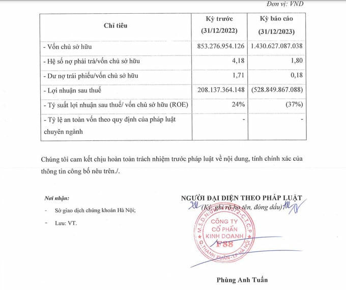 Theo đó, tỷ suất lợi nhuận sau thuế trên vốn chủ sở hữu của F88 âm tới 37%. Tính đến ngày 31/12/2023, vốn chủ sở hữu của F88 đạt hơn 1.430 tỷ đồng, tăng 67,6%. Nhưng hệ số nợ phải trả trên vốn chủ sở hữu của F88 giảm từ 4,18 lần xuống còn 1,8 lần tương ứng 2.575 tỷ đồng./.
