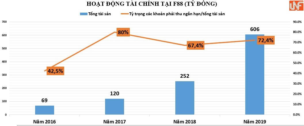 Việc mở rộng quy mô khá nhanh nên tài sản của F88 tăng trưởng rất mạnh trong giai đoạn 2016 – 2019 từ gần 69 tỷ đồng lên 606 tỷ đồng. Tuy nhiên các khoản phải thu ngắn hạn cũng tăng không kém. Cụ thể, tỷ trọng các khoản phải thu ngắn hạn trong tổng tài sản tăng từ 42,5% (năm 2016) lên 72,4% (năm 2019).