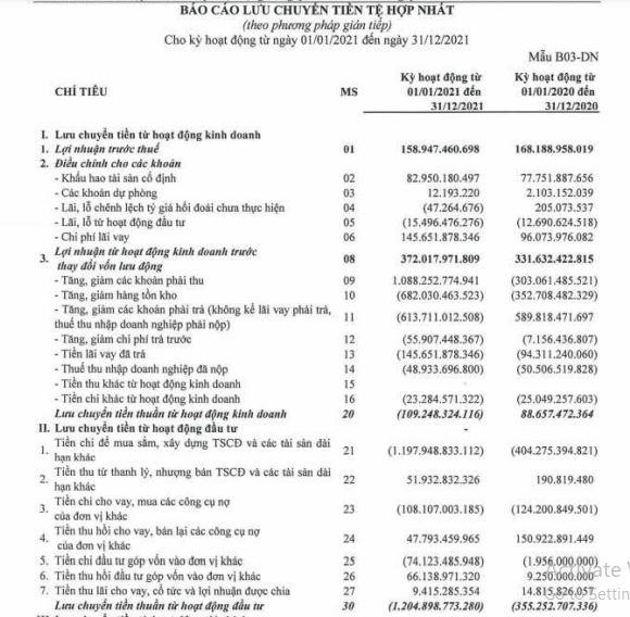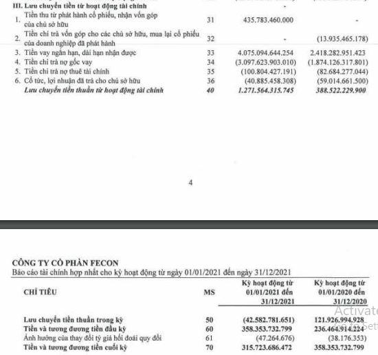 Cụ thể, năm 2021, dòng tiền thuần từ hoạt động kinh doanh âm hơn 109 tỷ đồng trong khi cùng kỳ 2020 dương hơn 88,6 tỷ đồng; Đáng nói, dòng tiền thuần từ hoạt động đầu tư âm gần 1.205 tỷ đồng trong khi năm 2020 chỉ âm hơn 355 tỷ đồng và chỉ có dòng tiền thuần từ hoạt động tài chính dương hơn 1.271 tỷ đồng. Do đó, dòng tiền thuần trong năm tại FCN âm tới 42,5 tỷ đồng trong khi cùng kỳ 2020 dương hơn 121,9 tỷ đồng.
