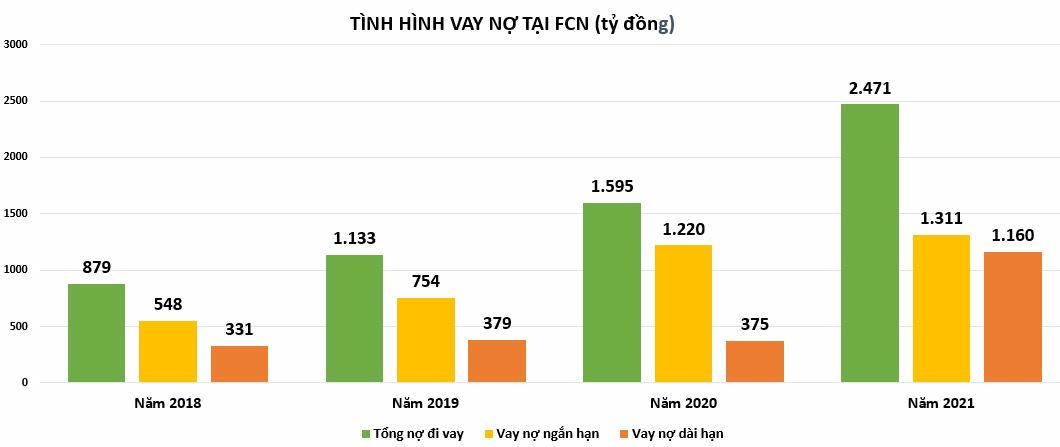 Cả dòng tiền từ hoạt động kinh doanh và đầu tư đều bị âm mạnh trong kỳ dẫn tới FCN phải tăng cường vay nợ. Năm 2021, tiền chi trả nợ gốc vay hơn 3.098 tỷ đồng (cùng kỳ 2020 chỉ ở mức 1.874 tỷ đồng); tiền vay ngắn hạn, dài hạn nhận được cũng tăng từ 2.418 tỷ đồng năm 2020 lên 4.075 tỷ đồng năm 2021.