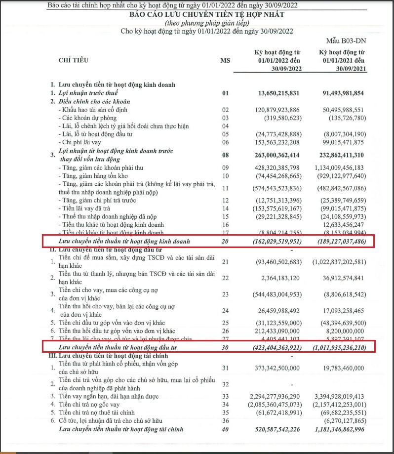 Điểm đáng chú ý trong báo cáo của FCN đó là tính đến ngày 30/9/2022 dòng tiền kinh doanh của công ty tiếp tục âm 162 tỷ đồng, tăng khoảng 27 tỷ đồng so với cùng kỳ trong khi quý II cũng âm 153 tỷ đồng. Trong khi đó, dòng tiền đầu tư cũng âm 423 tỷ đồng, tăng khoảng 588 tỷ đồng so với cùng kỳ do khoản tiền chi cho vay, mua các công cụ nợ của đơn vị khác.