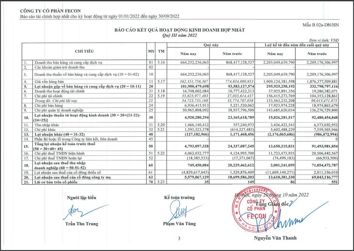 Theo Báo cáo tài chính hợp nhất quý III/2022 được FCN công bố cho thấy, trong quý III, doanh thu thuần của FCN đạt 664 tỷ đồng, giảm 23,5% so với cùng kỳ năm trước và giảm 36% so với quý II/2022. Tuy nhiên, so với cùng kỳ giá vốn bán hàng giảm khoảng 213 tỷ đồng. Theo đó lợi nhuận gộp trong kỳ của FCN đạt 102 tỷ đồng, tăng khoảng 8% so với cùng kỳ và giảm nhẹ so với quý II trước đó.