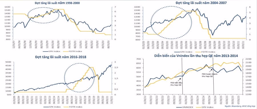 Cụ thể, trong 3 giai đoạn 1998 - 2000, 2004 - 2007 và 2016 - 2018, chỉ số S&P 500 đều ghi nhận xu hướng tăng và tạo đỉnh, nhưng lại lao dốc khi Fed bắt đầu giảm lãi suất. Trong lần tăng lãi suất 2013 - 2014 thì cả chỉ số S&P 500 và VN-Index đều ghi nhận xu hướng tăng.
