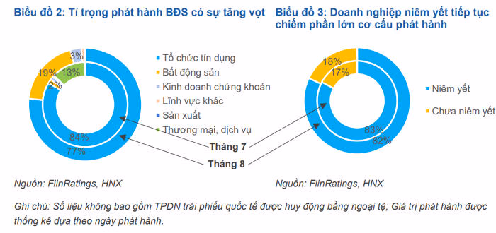 Trong tháng 8, nhóm doanh nghiệp bất động sản phát hành trái phiếu với giá trị tăng gấp 4.3 lần so với tháng 7 trước đó. FiinRatings lưu ý trong bản tin trái phiếu của mình rằng có một số doanh nghiệp thuộc nhóm ngành xây dựng nhưng lại phát hành trái phiếu cho các dự án bất động sản.