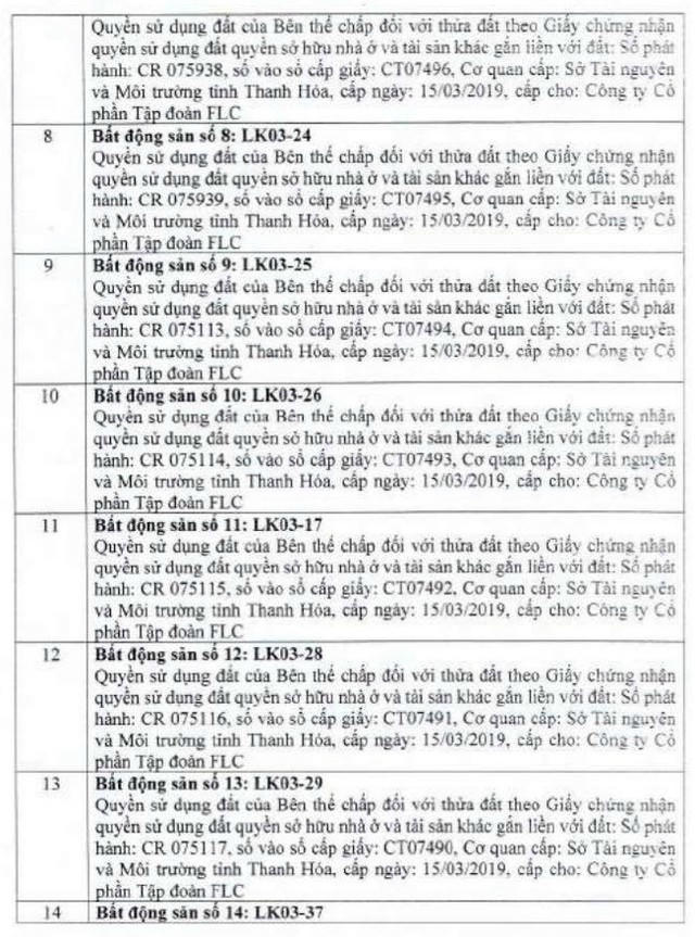 Các tài sản bảo đảm bao gồm cổ phiếu ROS, cổ phiếu BAV, bất động sản tại các tỉnh Thanh Hóa, Bình Định, Gia Lai, Quảng Ninh...mà FLC sở hữu.