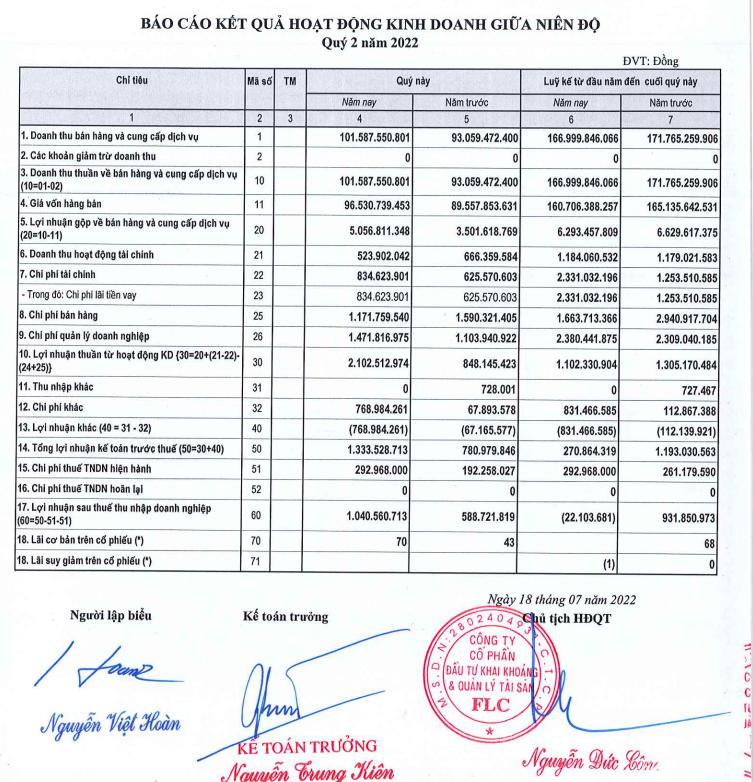 Theo báo cáo tự lập, CTCP Đầu tư khai khoáng và Quản lý tài sản FLC (GAB) ghi nhận lãi sau thuế quý II/2022 hơn 1 tỷ đồng, tăng 77% so với cùng kỳ, song, chi phí lãi vay cao đã nhấn chìm lợi nhuận bán niên 2022. FLC GAB cho hay, công ty đã mời nhiều công ty kiểm toán nhưng đều bị từ chối vì nguyên nhân khách quan liên quan đến vụ việc của ông Trịnh Văn Quyết.