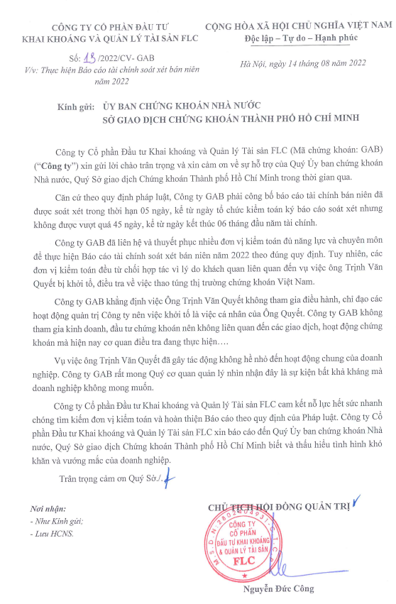 CTCP Đầu tư khai khoáng và Quản lý tài sản FLC - FLC GAB (Mã chứng khoán: GAB) vừa có văn bản gửi Sở Giao dịch chứng khoán TP.HCM (HOSE) về vấn đề công bố BCTC soát xét bán niên 2022.