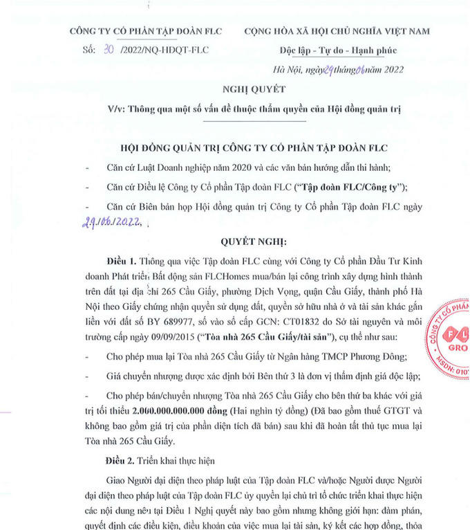 2 ngày trước thềm họp cổ đông, HĐQT FLC thông qua nghị quyết mua lại toà nhà 265 Cầu Giấy từ OCB để bán cho bên khác, với giá tối thiểu 2.000 tỷ đồng.