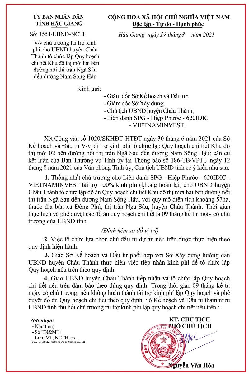 Đáng chú ý, mới đây UBND tỉnh Hậu Giang đã thống nhất chủ trương cho Liên danh SPG – Hiệp Phước – 620IDIC – VIETNAMINVES tài trợ 100% kinh phí (không hoàn lại) cho UBND huyện Châu Thành tổ chức lập đồ án quy hoạch Khu đô thị mới hai bên đường nối thị trấn Ngã Sáu đến đường Nam Sông Hậu.