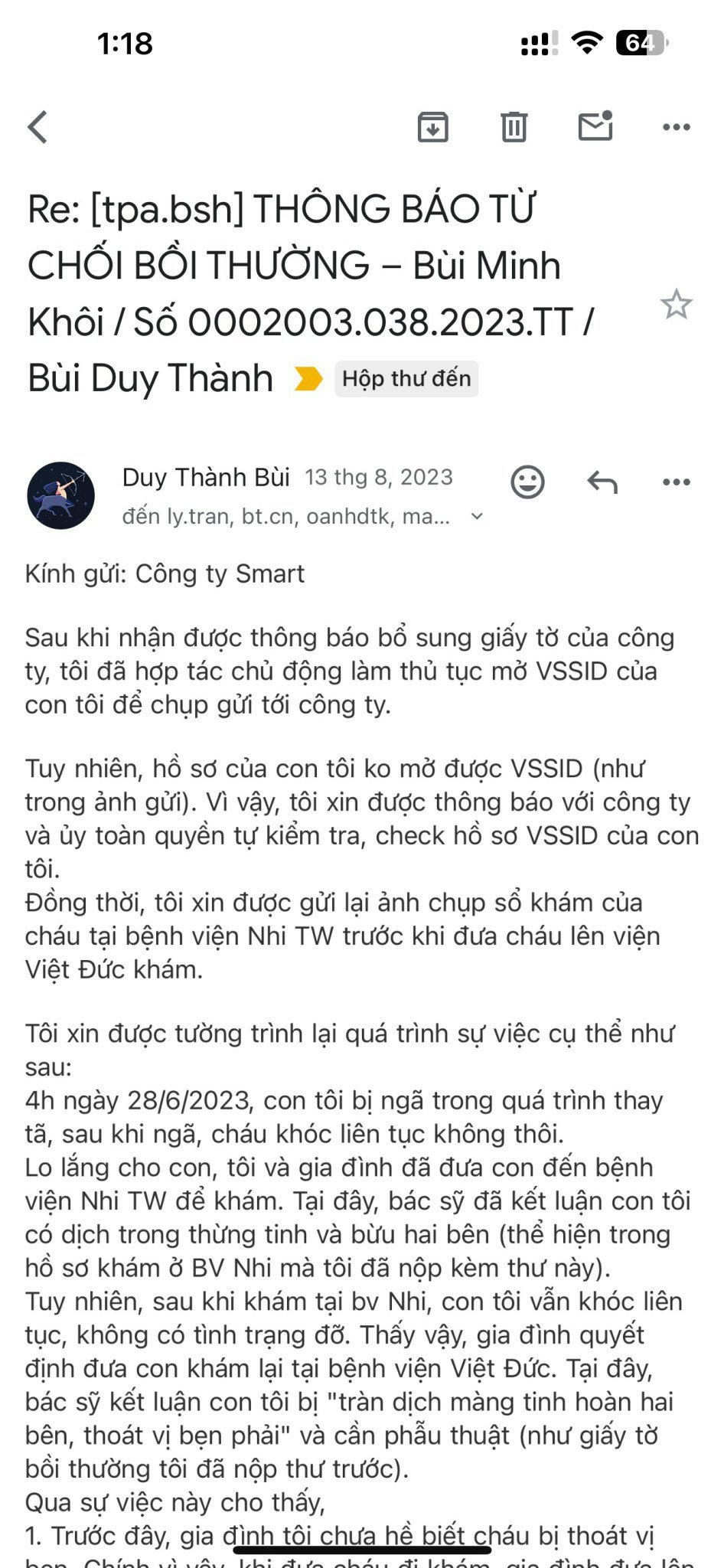 Ngày 21/07/2023, BSH từ chối chi trả bồi thường với lý do bệnh thoát vị bẹn của cháu là bệnh có sẵn. Nhận thấy không thoả đáng, Anh T gửi thư phản hồi cho BSH với các lý do sau.