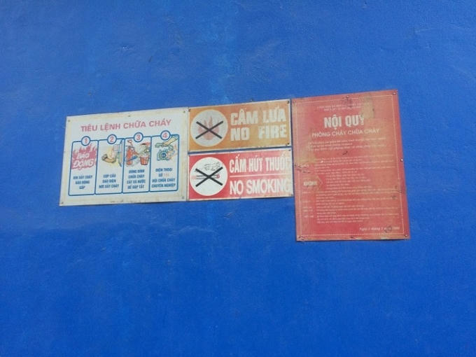 Bảng nội quy và tiêu lệnh chữa cháy rất sơ sài, nguy cơ cháy nổ từ kho chứa gas luôn rình rập tính mạng của người dân nơi đây.