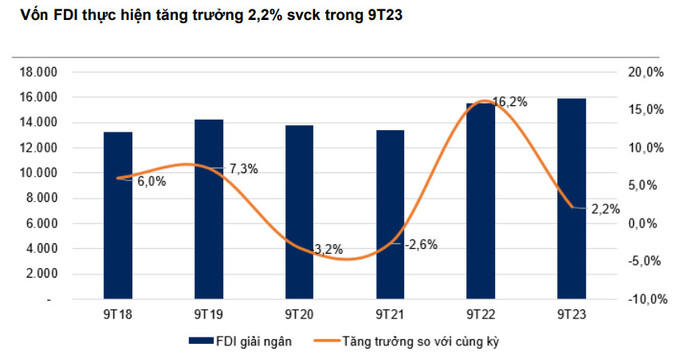 Vốn FDI thực hiện tăng 6,5% so với cùng kỳ, đạt 2,8 tỷ USD trong tháng 9/2023. (Nguồn: VNDirect Research)