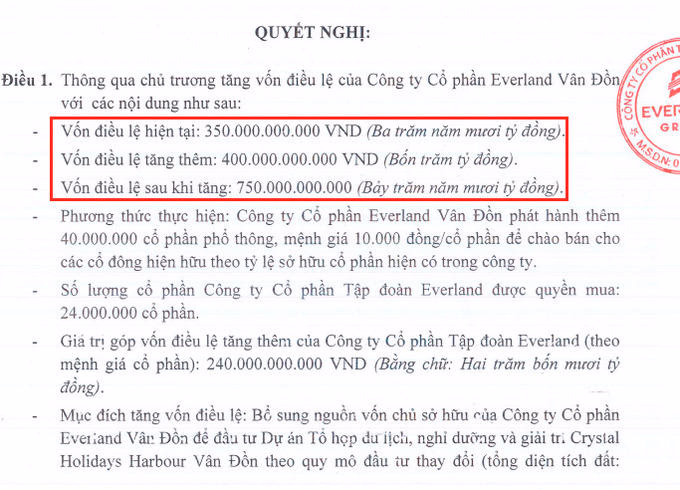 Tiếp đến trong tháng 4, EverLand lại tiếp tục công bố góp thêm vốn cho EverLand Vân Đồn thông qua việc mua 24/40 triệu cổ phiếu do EverLand Vân Đồn phát hành thêm. Mục đích của các lần bổ sung vốn cho EverLand Vân Đồn nhằm đầu tư dự án nghỉ dưỡng nói trên.