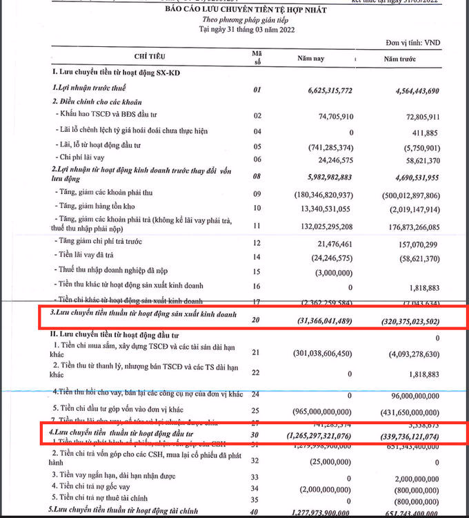 Tại bản báo cáo tài chính quý I năm 2022, EverLand tiếp tục bị âm nặng ở lưu chuyển tiền thuần từ hoạt động kinh doanh, gần 31.4 tỷ đồng. Mặc dù có xu hướng giảm so với cùng kỳ năm 2021 320.4 tỷ đồng) nhưng dòng tiền đầu tư lại âm nặng hơn 1.265 tỷ đồng, cùng kỳ năm 2021 là 339.7 tỷ đồng.
