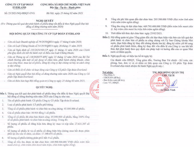 Theo nguồn tin từ Petrotimes, trước đó vào tháng 3/2021, EverLand đã hoàn tất chào bán 45 triệu cổ phiếu ra công chúng thu về hgần 450 tỷ đồng, trong đó có gần 207 tỷ đồng thu được từ đợt phát hành dùng để góp vốn cho EverLand Vân Đồn.