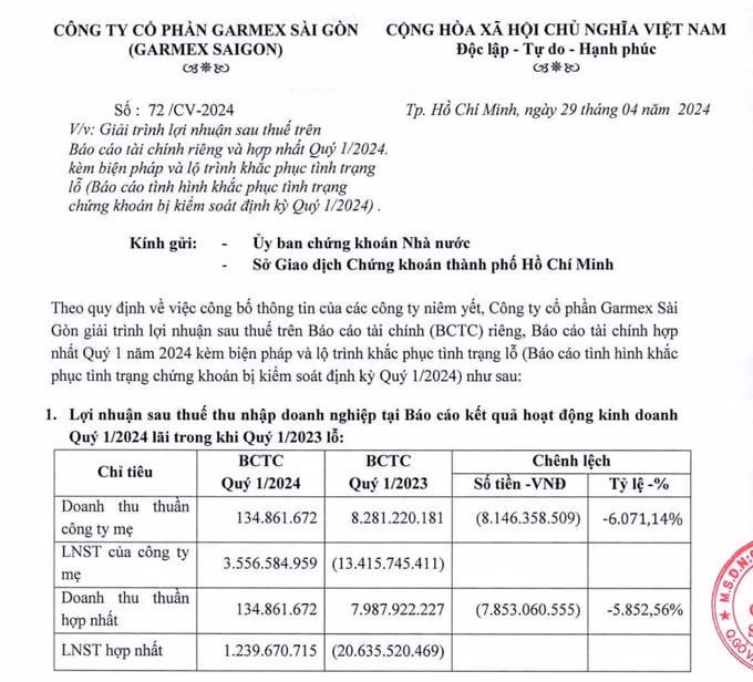 Ngày 29/4/2024, Công ty Cổ phần Garmex Sài Gòn đã có văn bản gửi UBCKNN và Sở Giao dịch Chứng khoán Tp.HCM về việc giải trình lợi nhuận sau thuế trên báo cáo tài chính riêng và hợp nhất Quý I/2024. Theo Garmex Sài Gòn, kết quả kinh doanh Quý I/2024 lãi trong khi Quý I/2023 lỗ tại Báo cáo tài chính hợp nhất chủ yếu là do giảm khoản chi phí thuế thu nhập hoãn lại, cụ thể: Quý I/2024, Công ty không có đơn hàng nên Doanh thu thuần Quý I/2024 trên Báo cáo Hợp nhất giảm 7,9 tỷ đồng so với Quý 1/2023. Doanh thu Quý 1/2024 là doanh thu dịch vụ.