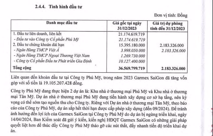Công ty cổ phần Phú Mỹ là công ty liên kết của Công ty cổ Phần Garmex Sài Gòn theo Nghị Quyết số 19/NQ-HĐQT/2023 như đã công bố thông tin ngày 11/07/2023. Công ty Cổ phần Phú Mỹ đang thực hiện 2 dự án gồm, Khu nhà ở thương mại Phú Mỹ và Khu nhà ở thương mại Tân Mỹ. Dự án nhà ở thương mại Phú Mỹ đang tiến hành xây dựng cơ sở hạ tầng, nên kỳ vọng có thể sớm tạo nguồn thu cho Công ty Garmex. Riêng với Dự án nhà ở thương mại Tân Mỹ, theo báo cáo của Công ty Cổ phần Phú Mỹ, dự án sắp hết thời hạn được cấp phép xây dựng (đến 09/2024). Để tránh ảnh hưởng đến lợi ích của Garmex SaiGon tại Công ty Cổ phần Phú Mỹ do dự án bị ngừng triển khai, ngày 14/04/2024, Ban Kiểm soát Công ty Garmex đã gửi ý kiến, kiến nghị HĐQT Garmex SaiGon có những giải pháp quyết liệt hơn để thúc đẩy Công ty Cổ phần Phú Mỹ tháo gỡ các nút thắt, đẩy nhanh tiến độ triển khai dự án.