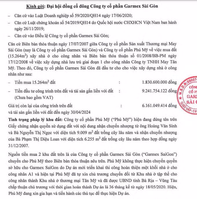Theo tờ trình số 05/TTr/ĐHĐCĐTN 2024 ngày 04/6/2024 về việc thỏa thuận mua đất xây dựng nhà ở cho công nhân giữa Công ty Cổ phần Garmex Sài Gòn và Công ty Cổ phần Phú Mỹ.