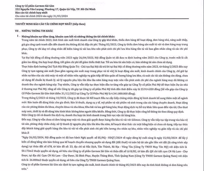 Theo thông tin báo cáo tài chính hợp nhất Quý I/2024 của Garmex Sài Gòn cho biết, ngày 26/2/2024, Hội đồng quản trị công ty này đã ban hành Nghị quyết số 05/NQ-HĐQT/2024 về ngày đăng ký cuối cùng ngày 15/3/2024 để lấy ý kiến cổ đông về việc thông qua kế hoạch chuyển nhượng quyền sử dụng đất (đất thuê) và toàn bộ tài sản gắn liền với đất (là công trình xây dựng) tại thửa đất số 678, tờ bản đồ số: 23, địa chỉ xã Hắc Dịch, Tân Thành, Bà Rịa - Vũng Tàu (Công ty TNHH May Tân Mỹ) với diện tích là 50.173m2 thuộc quyền sử dụng, sở hữu của Công ty cổ phần Garmex Sài Gòn và thửa đất số Lô B/B2, tờ bản đồ: QH chi tiết cụm CN Hà Lam - Chợ Được, tại địa chỉ: Cụm công nghiệp Hà Lam - Chợ Được, Xã Bình Phục, Huyện Thăng Bình, tỉnh Quảng Nam (Công ty TNHH Garmex Quảng Nam) với diện tích là 26.000m2 thuộc quyền sử dụng, sở hữu của Công ty TNHH Garmex Quảng Nam.