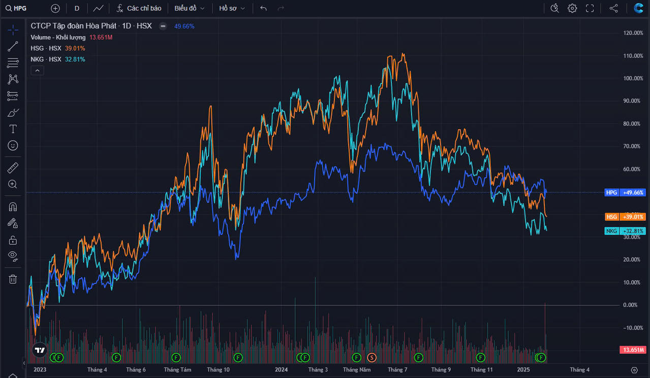 Cùng diễn biến với thị trường chung, bộ ba cổ phiếu thép HPG - HSG - NKG cũng trượt giá trong phiên hôm nay, gần như phủ định nỗ lực hồi phục trước đó. Dưới góc độ kỹ thuật, bộ 3 cổ phiếu trên đều cho tín hiệu tiêu cực khi có xu hướng thủng đáy. So với vùng đỉnh năm 2024, HPG - HSG - NKG lần lượt giảm 13,7% - 36% - 36%.