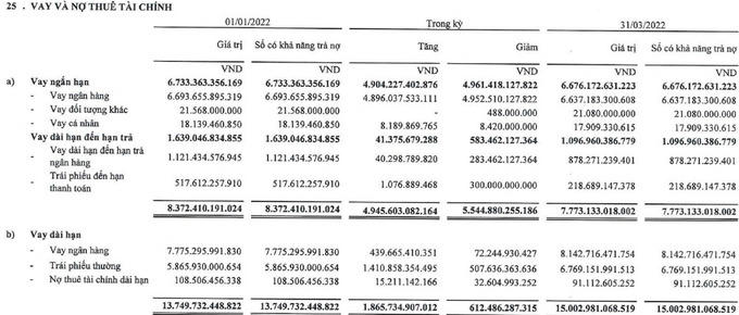 BCTC hợp nhất quý 1/2022 ghi nhận Gelex cũng là “con nợ” của ngân hàng với dư vay nợ thuê tài chính ngắn hạn đến 31/3/2022 hơn 7.770 tỷ đồng và dư vay nợ thuê tài chính dài hạn hơn 15.000 tỷ đồng, trong đó chủ yếu vay nợ ngân hàng và vay trái phiếu. Trong đó tổng vay nợ trái phiếu ghi nhận gần 7.000 tỷ đồng.