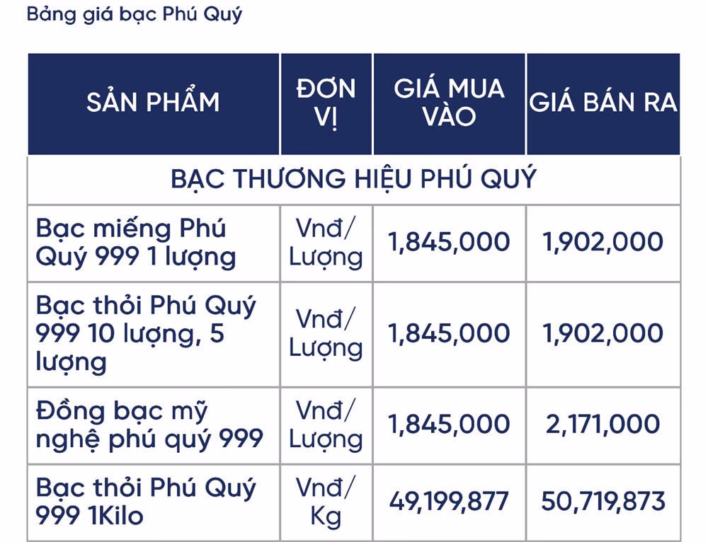 Tính đến 8h00 ngày 27/10, giá bạc miếng và bạc thỏi 999 (loại 1 lượng) tại trang web của Tập đoàn Vàng bạc Đá quý Phú Quý đồng loạt tăng mạnh và được niêm yết ở mức 1,845 - 1,902 triệu đồng/lượng (mua vào - bán ra).