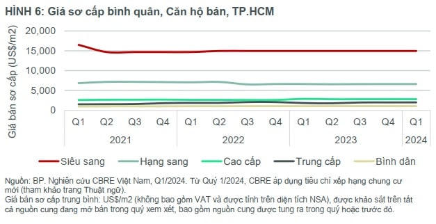 Còn tại TP. HCM, giá bán có diễn biến trái ngược với Thủ đô Hà Nội. Cụ thể, giá bán căn hộ sơ cấp tại TPHCM ở mức 61 triệu đồng/m2 (chưa bao gồm VAT), không thay đổi so với quý trước và giảm 3% so cùng kỳ năm ngoái. Như vậy, giá bán trung bình của các dự án sơ cấp và thứ cấp tại Hà Nội trong quý I/2024 tăng nhanh, tiệm cận mặt bằng giá tại TP. HCM.