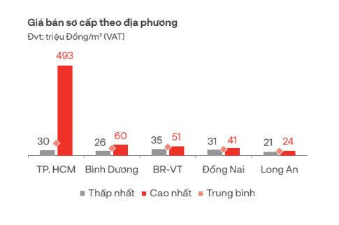 Đáng chú ý, giá bán căn hộ mới tại Tp.HCM tiếp tục ghi nhận mức chênh lệch lớn, khi giá bán căn hộ mới cao nhất lên tới 493 triệu đồng/m2, giá thấp nhất mở bán khoảng 30 triệu đồng/m2 – chênh lệch hơn 16,3 lần. Con số này lần lượt ở Bình Dương là 60 triệu đồng/m2 và 26 triệu đồng/m2, tại Bà Rịa – Vũng Tàu là 51 triệu đồng/m2 và 35 triệu đồng/m2, Đồng Nai là 41 triệu đồng/m2 và 31 triệu đồng/m2, Long An là 24 triệu đồng/m2 và 21 triệu đồng/m2.