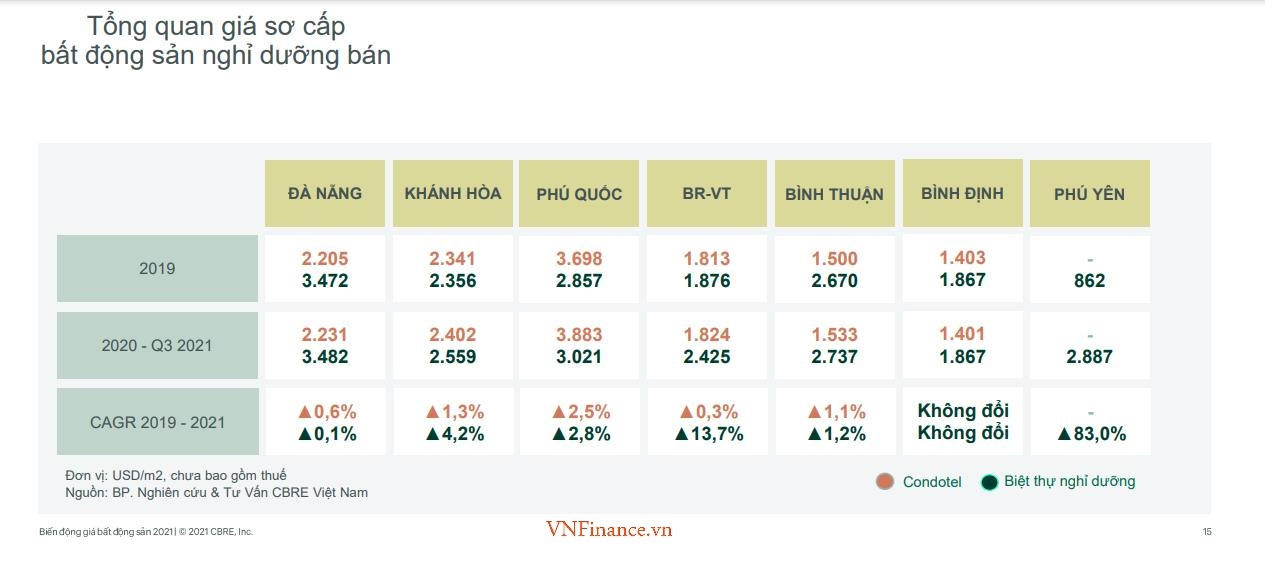Về nguồn cung biệt thự nghỉ dưỡng thì Bà Rịa - Vũng Tàu, Bình Thuận và Phú Quốc là những thị trường dẫn đầu về số lượng tính đến quý III/2021. Đặc biệt, giá bán biệt thự nghỉ dưỡng tăng ngay cả trong thời kỳ bị tác động bởi Covid-19, đặc biệt tại các thị trường cấp 2 như Phú Yên và Bà Rịa - Vũng Tàu.