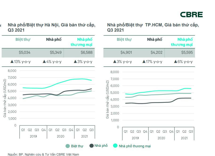 Tại Hà Nội, giá bán biệt thự đã tăng 13%, nhà phố tăng 4%, nhà phố thương mại tăng 3%. Trong khi đó, tại TP. Hồ Chí Minh, biệt thự tăng 3%, nhà phố tăng 17%, nhà phố thương mại tăng 6%. Báo cáo của CBRE cũng cho biết giữa 2 thành phố lớn là Hà Nội và TP HCM, nhà phố, biệt thự, nhà phố thương mại ghi nhận những diễn biến trái chiều trong 3 quý đầu năm 2021 so với cùng kỳ năm 2020.