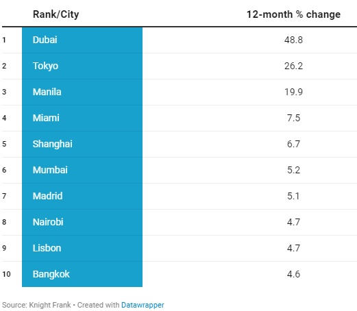 Chiếm vị trí thứ 2 và 3 là Tokyo với mức tăng hàng năm là 26,2% và Manila tăng 19,9%.
