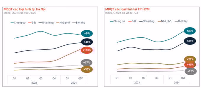 Tại hai thị trường lớn nhất cả nước là Hà Nội và TP.HCM, hầu hết các loại hình bất động sản đều ghi nhận lượt tìm kiếm tăng trưởng tích cực trong hai quý đầu năm.