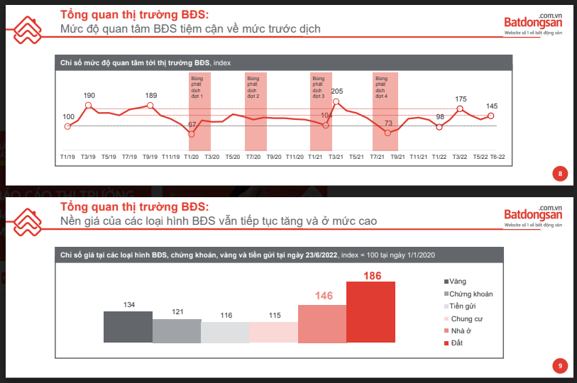 Trải qua 2 năm dịch bệnh kéo dài, thị trường nhà đất, vàng, chứng khoán và tiền gửi tiết kiệm ghi nhận nhiều diễn biến thăng trầm. Theo báo cáo thị trường bất động sản quý 2/2022 của Batdongsan.com.vn, trong khoảng thời gian từ 1/2020 đến tháng 6/2022, đất và nhà ở có chỉ số tăng giá cao nhất, xếp sau đó là vàng, chứng khoán và tiền gửi tiết kiệm.