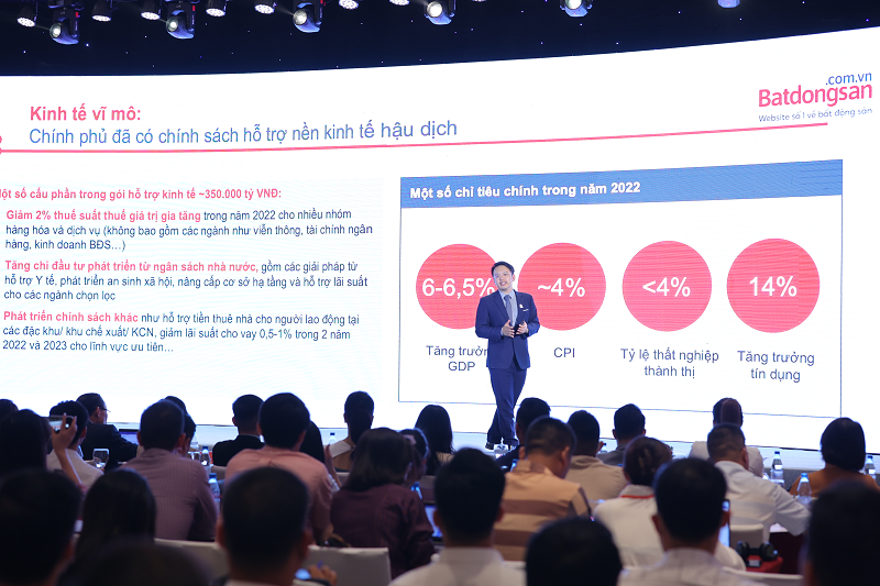 Về tình hình kinh tế cả nước trong 6 tháng đầu năm, ông Nguyễn Quốc Anh, Phó TGĐ Batdongsan.com.vn cho biết, nền kinh tế đang có sự phục hồi tích cực và rõ nét. Số liệu từ Tổng cục thống kê cho thấy quý 2/2022, GDP bình quân đạt 7,72%, tăng 1,02% so với cùng kỳ; chỉ số tiêu dùng (CPI) đạt 2,96%, giải ngân vốn đầu tư FDI hiện vào khoảng 10,06 tỷ USD, tăng 8,8% và xuất khẩu đạt 186 tỷ USD, tăng 17,3% so với cùng kỳ 2021.