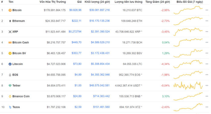 Đầu giờ sáng hôm nay ngày 11/2, cập nhật lúc 7h30 giờ Việt Nam, thị trường tiền ảo ngập sắc xanh. Trong đó, Bitcoin giảm 2,95%, giao dịch tại ngưỡng 9.828 USD/BTC, giảm 262,46 USD so với hôm qua.