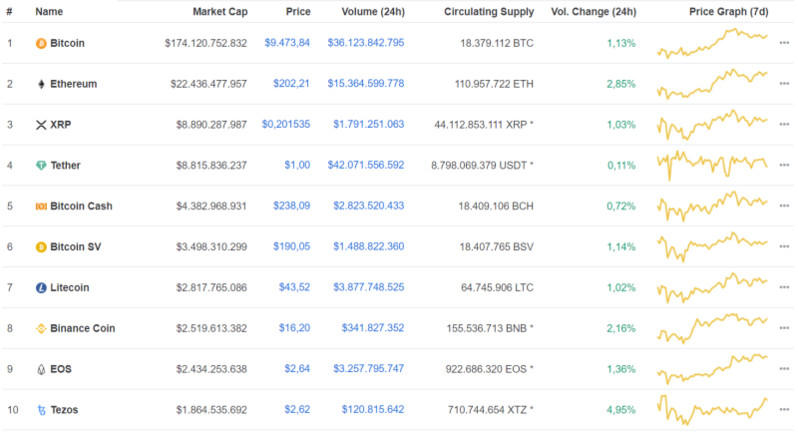 Sang hôm nay ngày 17/5, cập nhật lúc 8h15 giờ Việt Nam, Bitcoin đang quay đầu tăng 1,13%, hiện giao dịch ở mức 9.473 USD/BTC. Trong 10 đồng tiền điện tử đứng đầu thị trường, cả 10 đồng tiền đều đang tăng điểm.