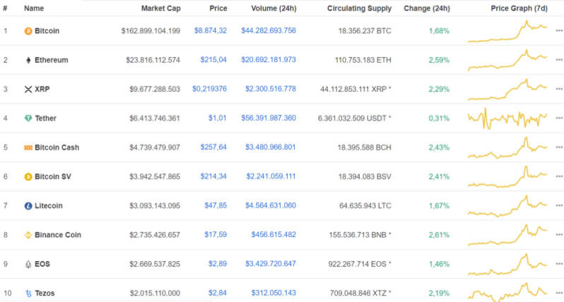 Sang hôm nay 2/5, thị trường tiền điện tử đảo chiều hồi phục ngập sắc xanh. Top 10 đồng tiền điện tử đứng đầu thị trường đều tăng giá. Trong đó, Bitcoin tăng 1.68%, giao dịch ở mức 8.874,32 USD/BTC.