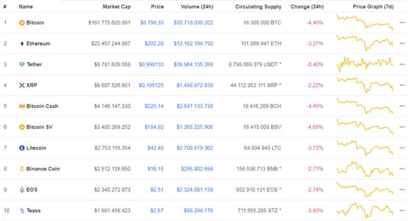 Trong nhóm 10 tiền ảo dẫn đầu về vốn hóa trên Coinmarketcap, đa số các đồng tiền đều giảm giá.