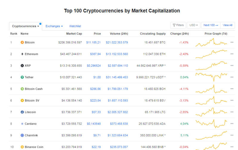 Trong top 10 loại tiền ảo đứng đầu có tới 7/10 đồng tiền giảm điểm trong 24 giờ. Đồng Bitcoin giảm 1.43%, hiện được giao dịch ở mức giá 11.185 USD/BTC.
