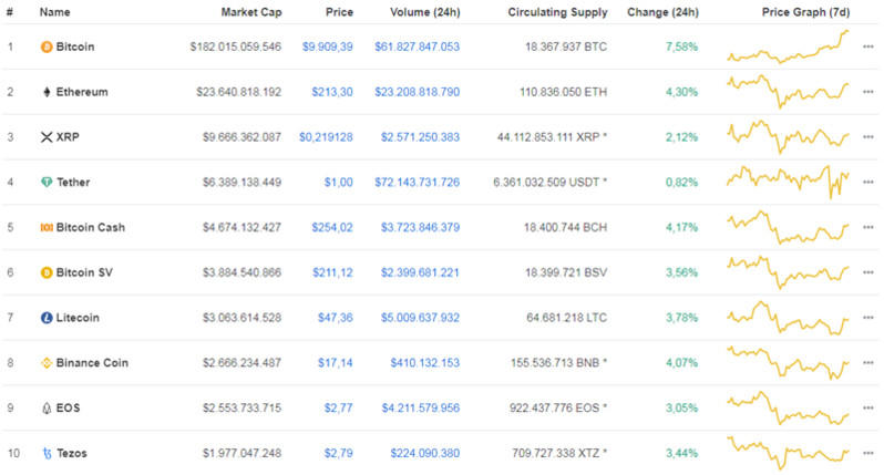 Sang hôm nay 8/5, thị trường tiền điện tử phục hồi ngập sắc xanh. Top 10 đồng tiền điện tử đứng đầu thị trường cả 10 đồng tiền tăng giá. Trong đó, Bitcoin tăng mạnh 7.58%, giao dịch ở mức 9.909,39 USD/BTC
